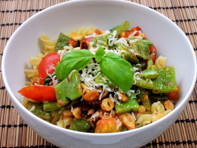 Sdílet Těstoviny se zelenými fazolkami, rajčátky a kešu oříšky Na 2 porce budeme potřebovat: 10 cherry rajčátek 6 dlouhých plochých fazolových lusků 2 hrsti kešu oříšků 2 stroužky česneku Do plavek Rychlé recepty k obědu Snadno a rychle Vegetariánské recepty