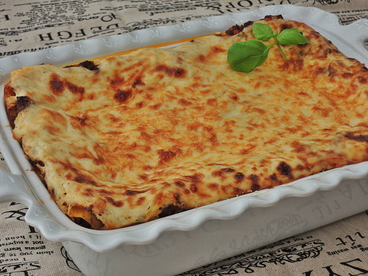 Pekáček vymažeme máslem, na dno poskládáme vrstvu plátků lasagní, rozetřeme na část ragú a pokapeme bešamelem. Položíme další vrstvu lasagní a zase navrstvíme ragú a na něj opět trochu bešamelu. Končíme těstovinami, zbytkem ragú a zbytkem bešamelu. Posypeme lehce zbytkem nastrouhaného sýra.