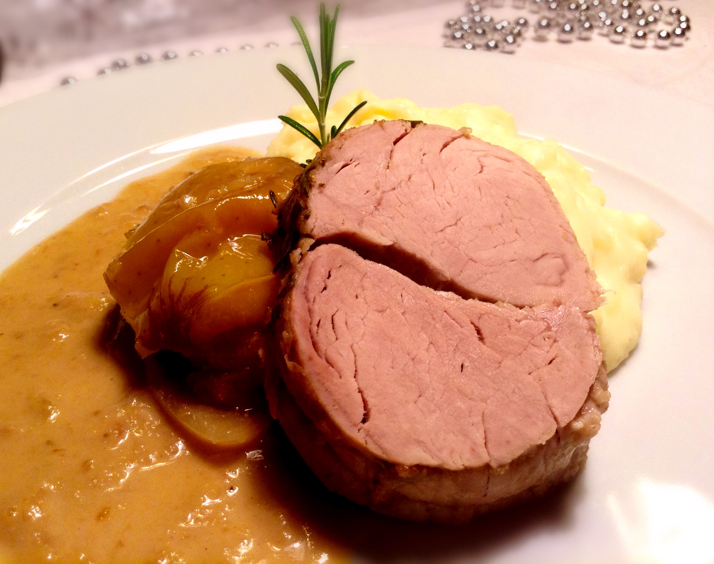 Podáváme na talíř tak, že dospod navrstvíme odložená jablka s cibulkou, na ty položíme nakrájenou panenku a vše přelijeme štávou z pánve.