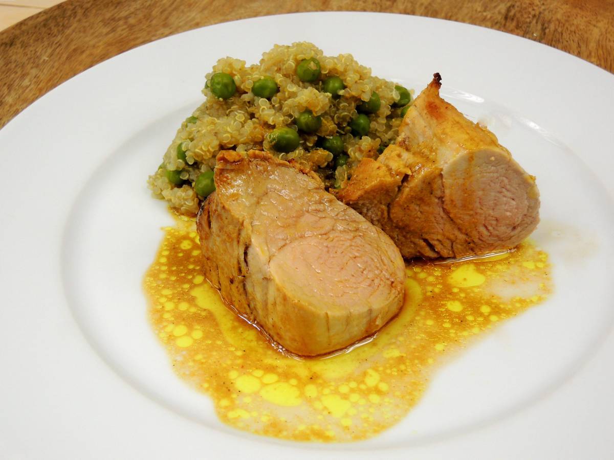 Když je panenka namarinovaná, nakrájíme šalotku a česnek na plátky a chilli na maličké kousíčky. Quinou namočíme na 10 minut do studené vody. Pak ji přecedíme a ještě propláchneme tekoucí vodou. Vrátíme do hrnce, dolijeme vodu, přidáme rozdrobený bujón a hrášek a 10 minut povaříme. Stáhneme z plotny a neště necháme 10 minut pod pokličkou odpočívat.
