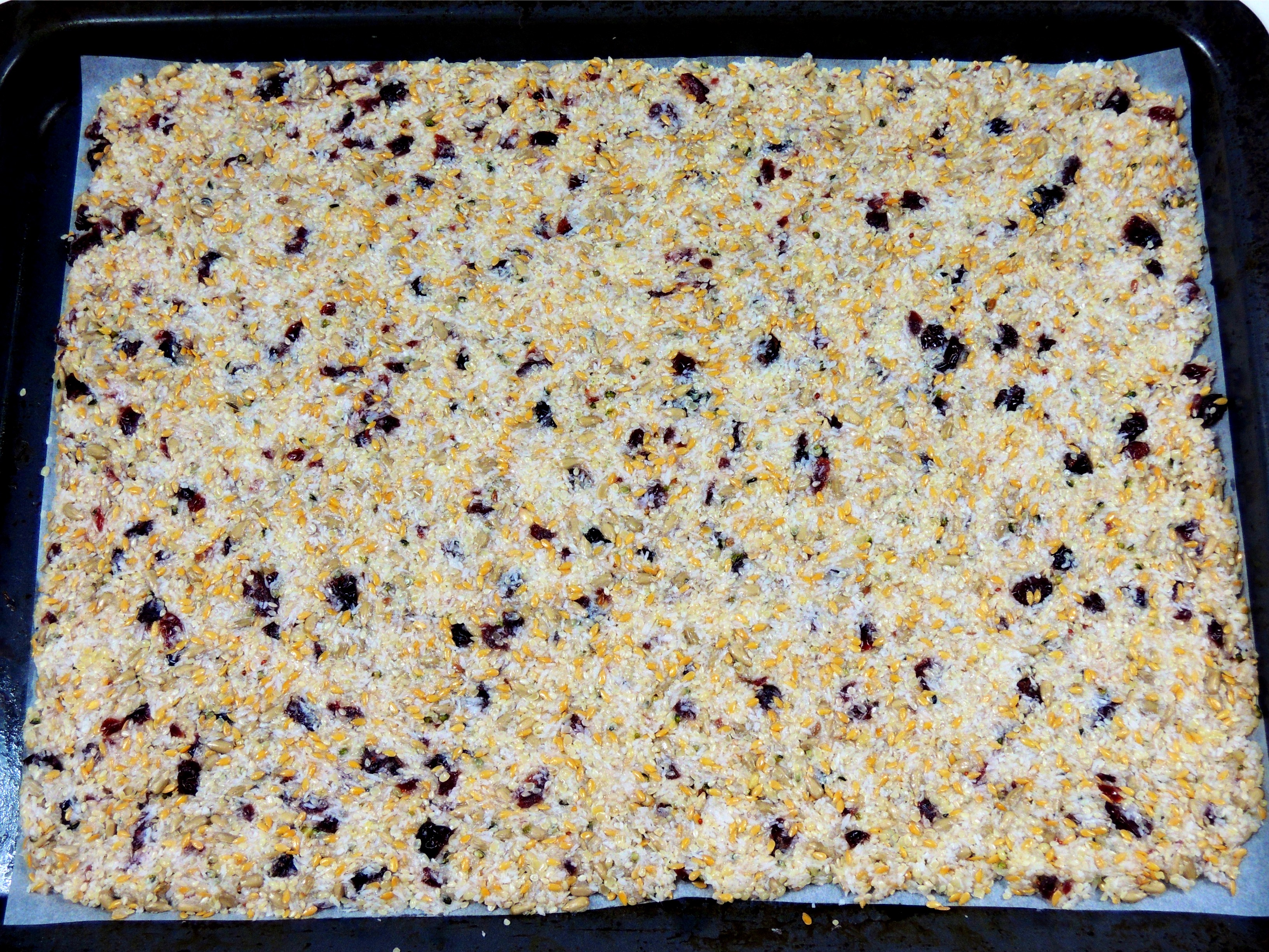 Plech vyložíme pečícím papírem a semínkovou směs na něj vyklopíme. Namočenýma rukama roztáhneme po celém plechu a upěchujeme. Pečeme v troubě vyhřáté na 160 st. asi 20 minut. Potom vytáhneme z trouby (troubu necháme zapnutou), rozkrájíme kolečkem na pizzu nebo ostrým nožem na kostičky. V případě, že jsou okraje zlatavé, odebereme je. Troubu vypneme a zbytek krekrů do ní vrátíme zpátky a dosušíme dalších cca 15 minut.