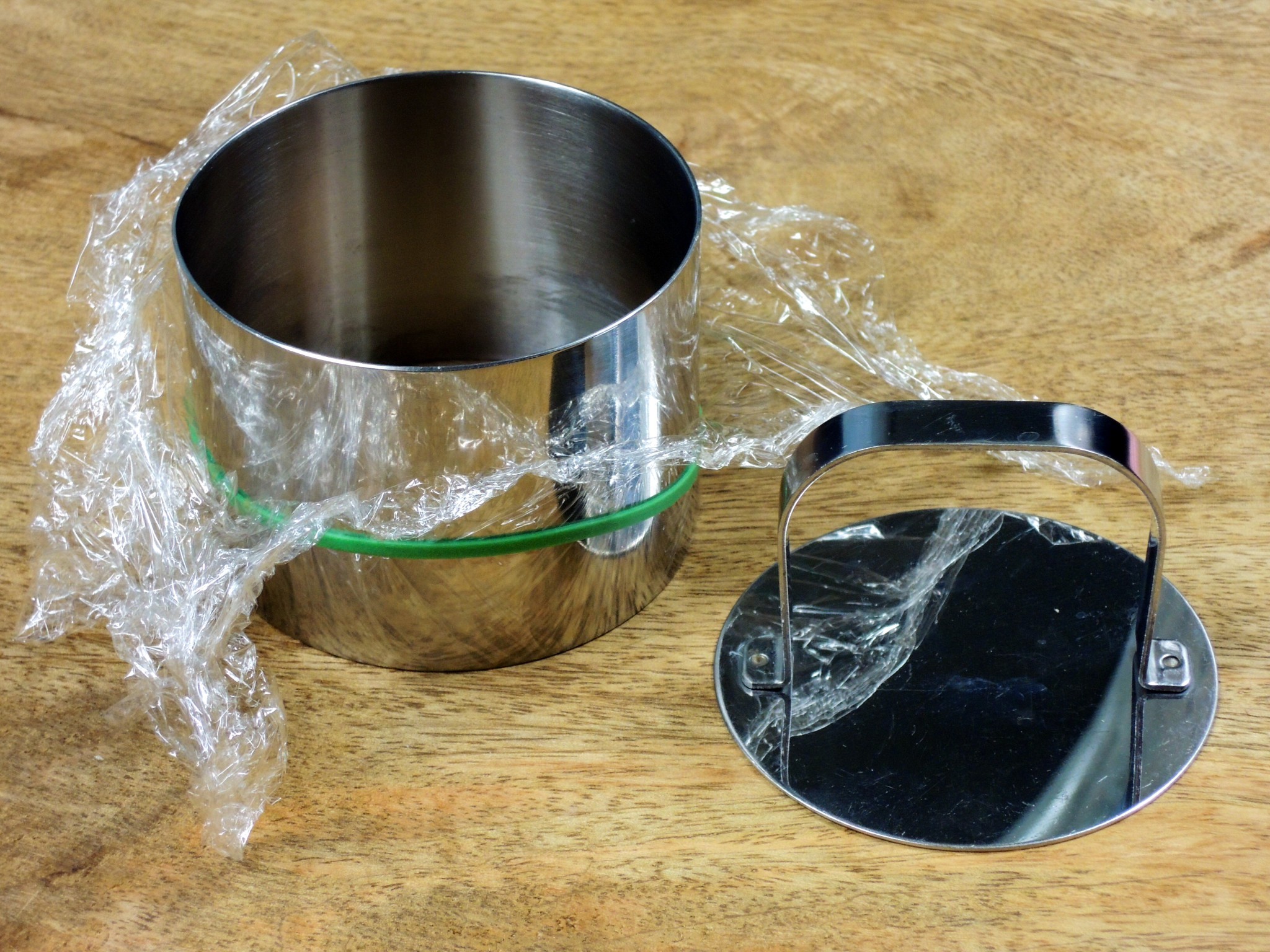 Na tyto mini dortíky se hodí ocelová tvořítka (obruče) o průměru 7-8 cm a výšky cca 6 cm, přilnavá fresh fólie a pevné gumičky. Tvořítkům uděláme „dno“ z vypnuté fresh fólie, kterou po obvodu přichytíme gumičkou.