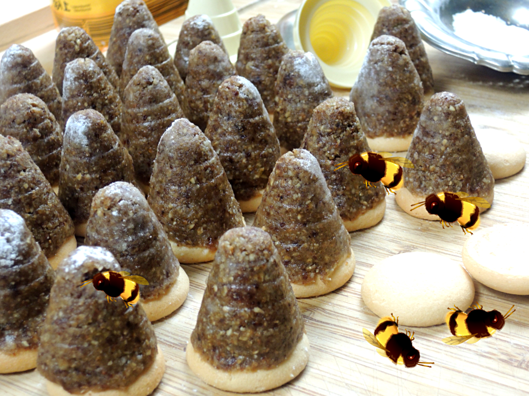 Z těsta utvoříme 30 kuliček. Formičku vysypáváme cukrem a vtlačujeme do ní postupně kuličky. Palcem tvoříme uprostřed prohlubeň. Těsto ve formě úlu vyklepáváme na vál, pomocí malé lžičky plníme náplní a zavíčkujeme piškotem. Okraje připevníme.