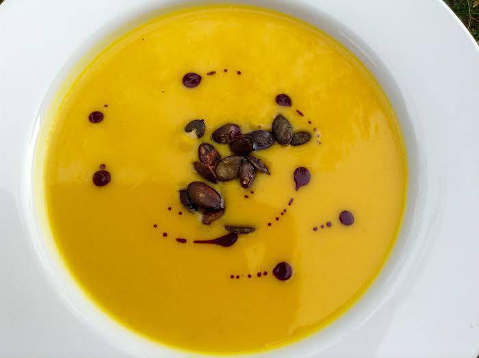 Polévka z dýně Hokaido s ovocem a kokosovým mlékem