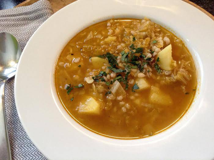 V hrnci rozehřejeme olej a orestujeme na něm nakrájenou cibulku a česnek. Přidáme oloupané, pokrájené brambory a omyté a pokrájené listy kapusty. Z kapustových listů odkrojíme silné řapíky. Přidáme papriku a chilli koření, promícháme a zalijeme vodou. Do polévky přidáme kmín, bujon a cibulová semínka. Povaříme přibližně 15 minut. Potom přidáme uvařené kroupy, ještě chvilku povaříme a dle potřeby dochutíme solí. Na talířích polévku ozdobíme nasekanou celerovou natí.