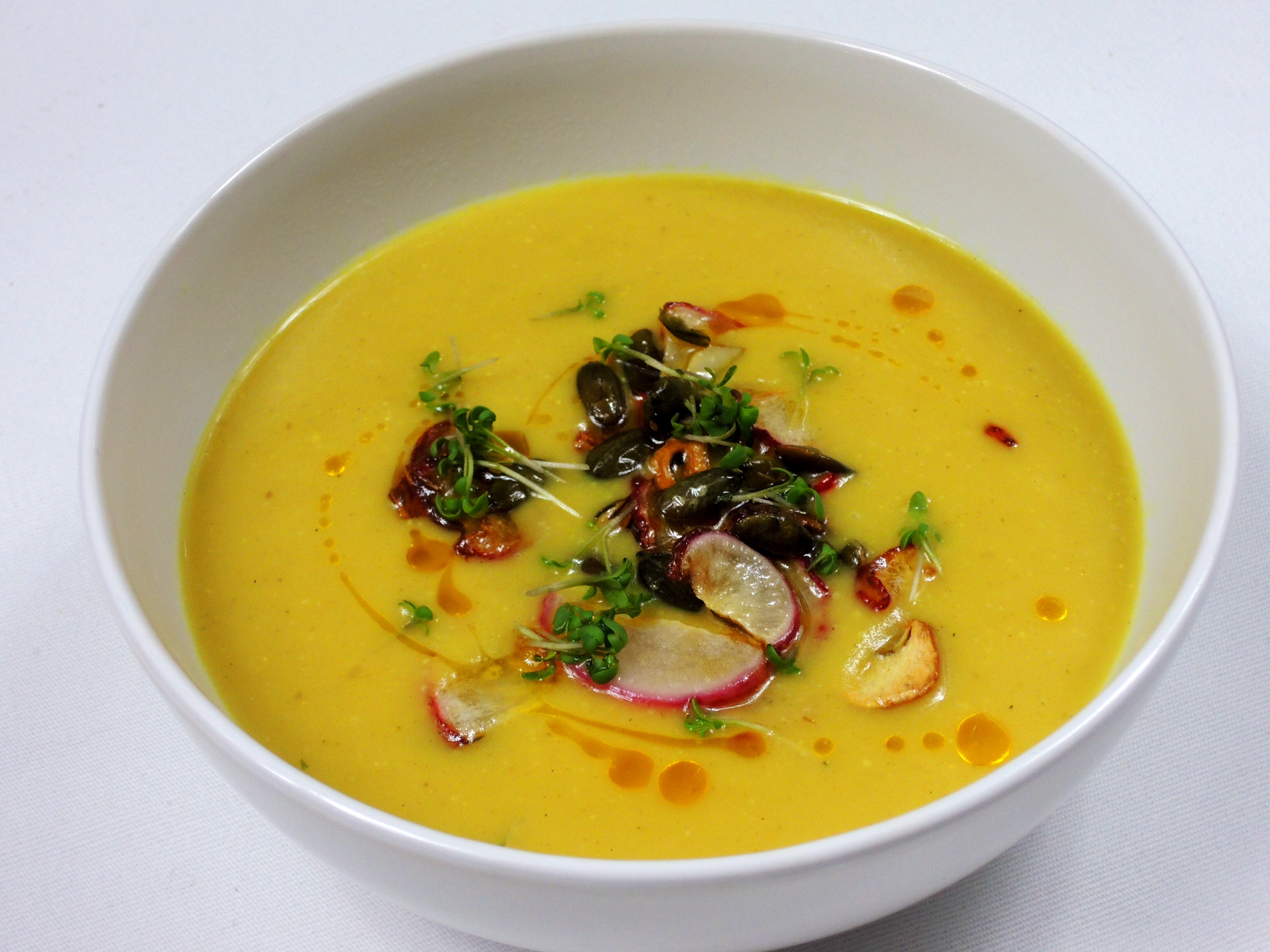 Polévku rozdělíme na porce, posypeme restovanými ředkvičkami a čerstvou řeřichou.