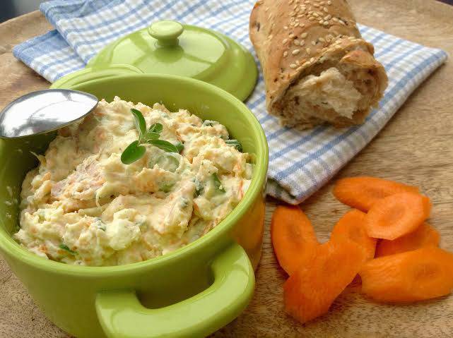Vejce uvaříme natvrdo – 5 minut, zchladíme studenou vodou, natlučeme a oloupeme. Rozstrouháme na jemném struhadle. Dáme do misky, přidáme jemně nastrouhanou mrkev, na kousky nakrájenou šunku a cibulku. Zamícháme, přidáme lučinu s mascarpone, osolíme, opepříme a dochutíme citronovou šťávou. Důkladně promícháme a necháme v lednici aspoň půl hodinky rozležet.