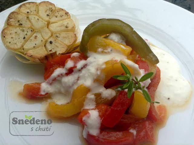 Paprikové proužky nandáme na talíře, vedle položíme grilovaný česnek a zakapeme přelivem.
