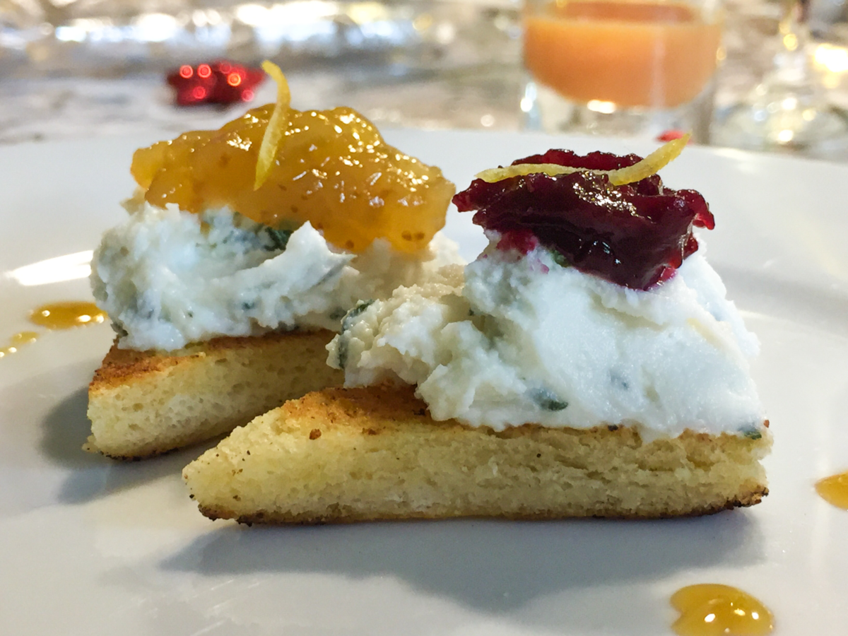 Kozí sýr s Gorgonzolou, nadrobno nasekanou šalvějí a olejem rozmačkáme vidličkou. Z toustového chleba odkrájíme okraje a příčně rozkrojíme na trojúhelníčky. Ty opečeme z obou stran na másle. Na každý kousek navrstvíme bohatou vrstvu sýrové směsi, ozdobíme lžičkou zvolené marmelády.