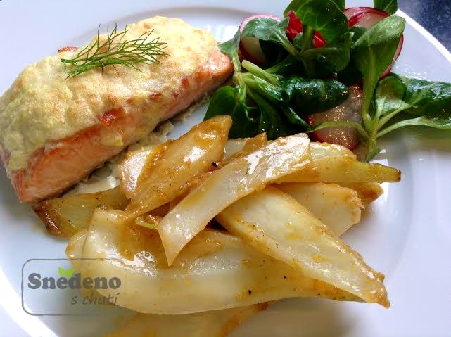 Z fenyklu odkrojíme tuhé stonky, rokrojíme na půlku, vykrojíme košťál a nakrájíme na cca centimetrové nudličky. Na pánvi rozehřejeme olej, opečeme na něm plátky fenyklu spolu s troškou cukru. Podlijeme vínem a trochou vody, přidáme kari pastu, přiklopíme pokličkou a dusíme doměkka. Chvíli před změknutím přidáme zbytek citronové kůry a trochu citronové šťávy.