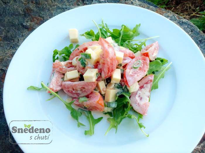 Rajčata omyjeme, vykrojíme bubáky a nakrájíme na dílky. Přidáme na kousky nakrájenou cibulku a na kostičky nakrájený sýr. Ze zakysanky, cukru, soli a hořčice umícháme zálivku a nalijeme na rajčata. Přidáme natrhané lístky bazalky, promícháme a na talířích navrstvíme na hnízda z rukoly.