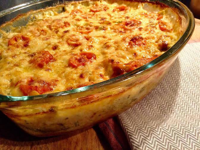 Přiklopíme pokličkou nebo alobalem a 25 minut zapečeme při 180 st. C. Potom pokličku sundáme, posypeme jemně nastrouhaným sýrem a zapečeme dozlatova dalších cca 20 minut.