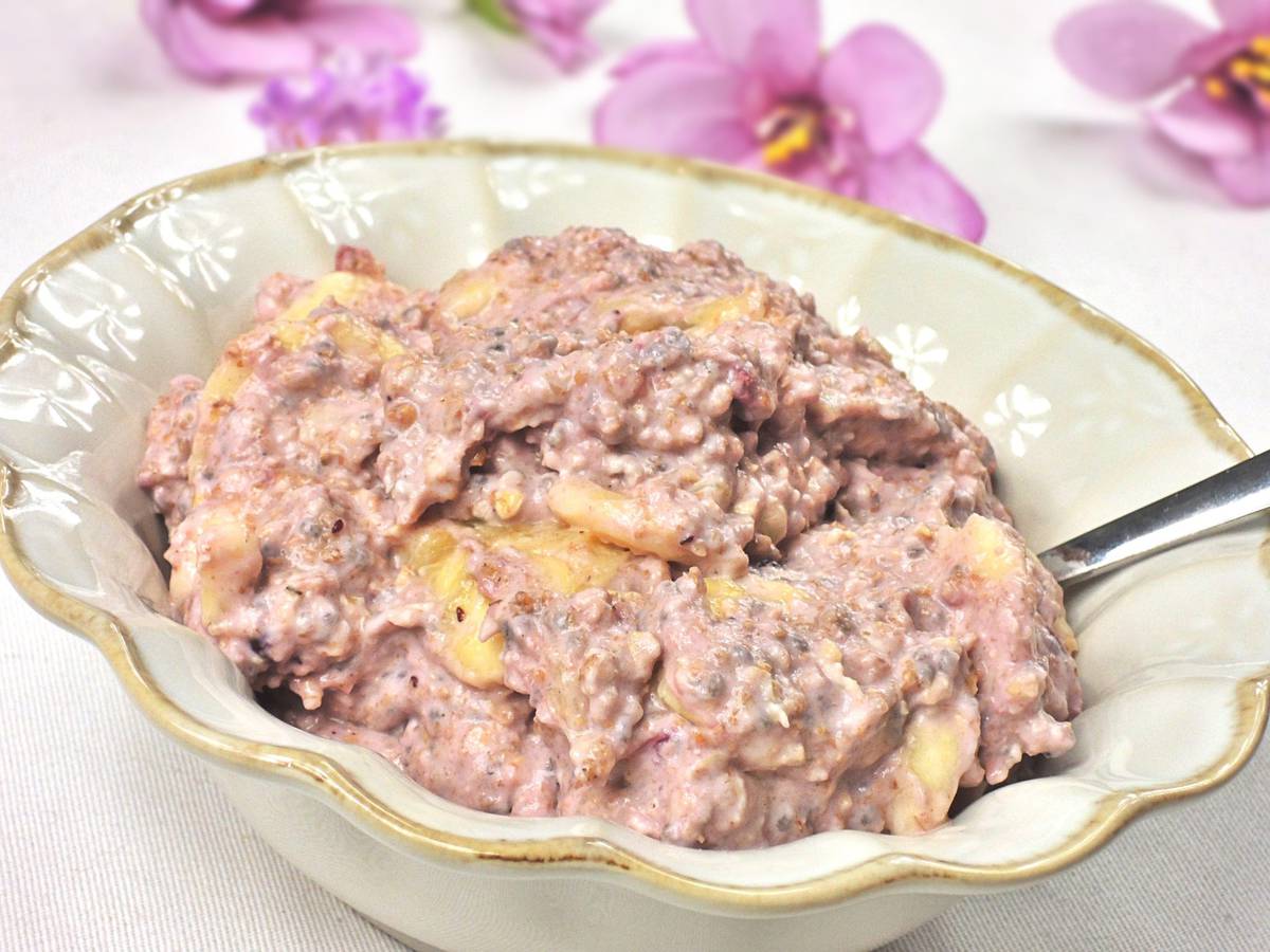 Banán rozmačkáme vidličkou a smícháme s jogurtem, vločkami, kompotovanými brusinkami a chia semínky. Promícháme a necháme proležet.